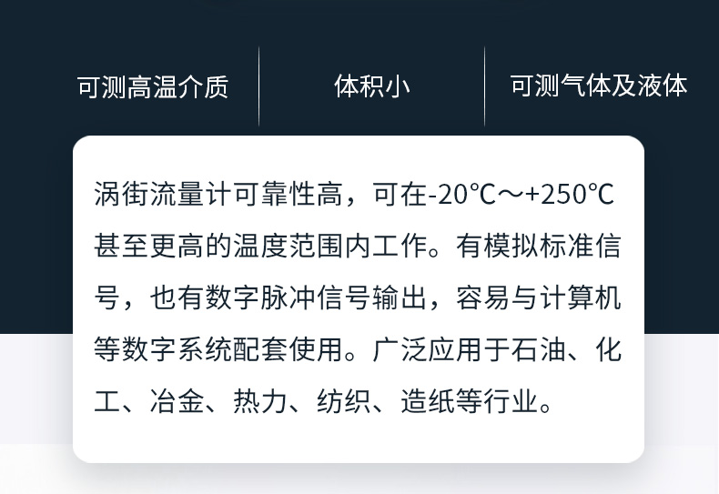 渦街流量計(jì)可靠性高,可在-20℃~+250℃甚至更高的溫度范圍內(nèi)工作。有模擬標(biāo)準(zhǔn)信號,也有數(shù)字脈沖信號輸出,容易與計(jì)算機(jī)等數(shù)字系統(tǒng)配套使用。廣泛應(yīng)用于石油、化工、冶金、熱力、紡織、造紙等行業(yè)。